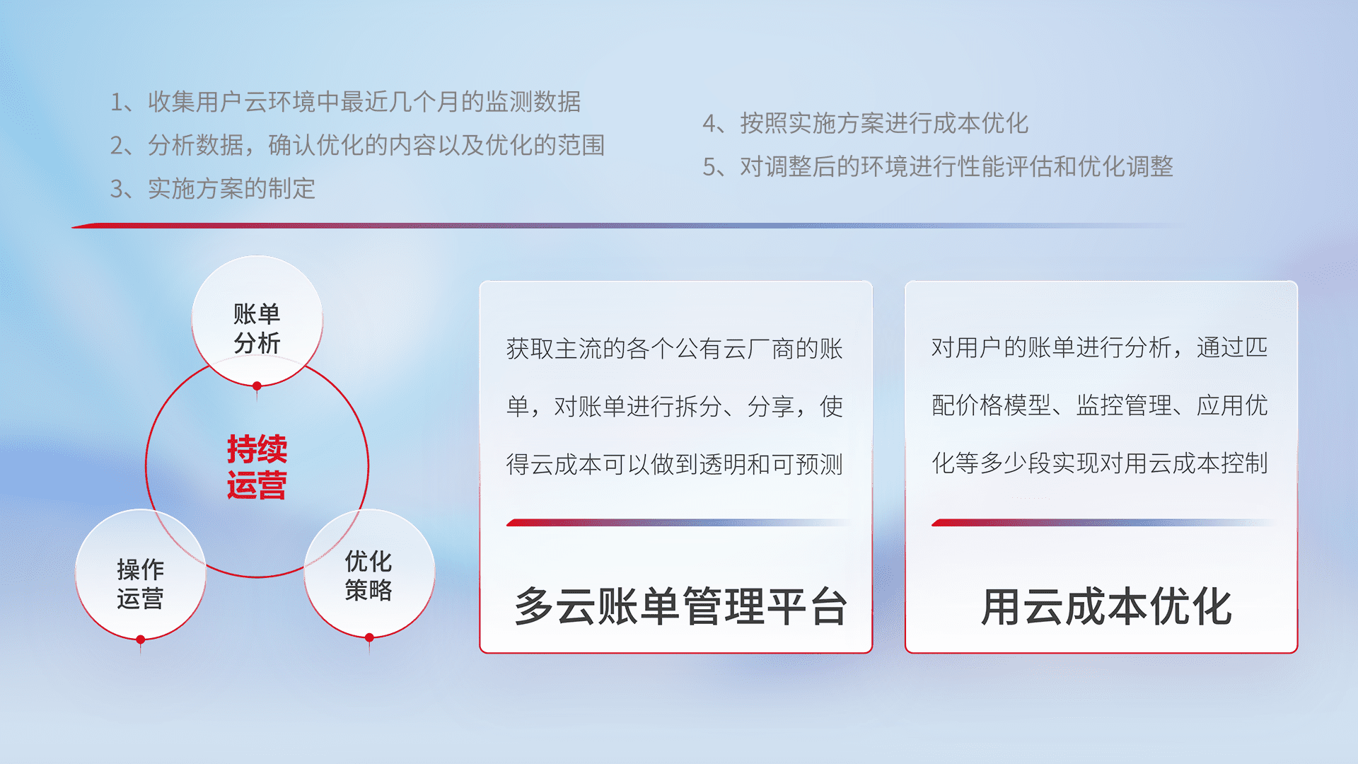 通过多云纳管,,以统一的资源数据模型把客户的云资源进行抽象和封装,,,进而实现对多云资源的统一操作,,,保障云资源管理的可靠性、、稳定性与可用性。。。。量身定制化运维内容,,,,配置、、、、开发运维、、、、补丁管理、、备份、、监控、、、、认证和访问管理、、、审计和日常巡检等,,保障在用云过程中的可靠度,,,稳定度以及高可用率。。